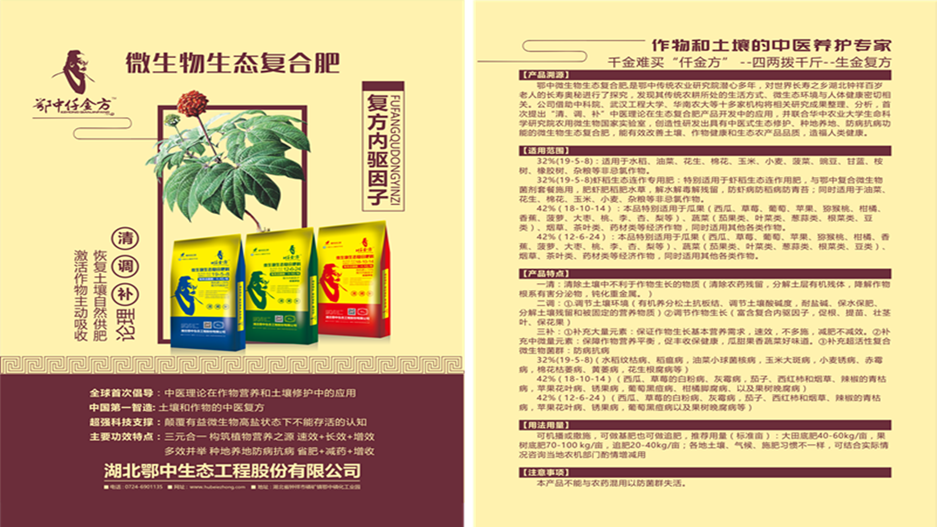 超強科技支撐的鄂中微生物生態復合肥系列命名“鄂中仟金方”并以“作物和土壤的中醫養護專家”形象問世。鄂中仟金方正是遵循傳統中醫“清毒、和調、養正”的健康理論,融合多種功能性物質,復配成復方內驅因子,以整體性和系統性的中醫規律恰當處理有機養分、無機養分、土壤微生物菌群的關系,創造性地提出了”一清、二調、三補“的作物和土壤的中醫養護理論。一清:清除土壤中不利于作物生長的物質。鄂中仟金方能清除農藥殘留,分解土層有機殘體,降解作物根系有害分泌物,鈍化重金屬。二調:一是調節土壤環境。鄂中仟金方所含的有機養分可松土、抗板結、調節土壤酸堿度,耐鹽堿、保水保肥、分解土壤殘留和被固定的營養物質;二是調節作物生長。鄂中仟金方富含復合內驅因子,可促根、提苗、壯莖葉、保花果。三補:一補大量元素。鄂中仟金方合理配比中低濃度NPK含量,能保證作物生長基本營養需求,速效,不多施,省肥不減效;二補中微量元素:鄂中仟金方添加多種螯合態中微量元素,可保障作物營養平衡,促豐收保健康,瓜甜果香蔬菜好味道;三補微生物及復方內驅活性物質:特別添加具有超活性復合微生物菌群,具有耐高溫、耐高鹽、500天超長生命力的特點,能激活土壤中沉積的養分,大幅提升肥料利用率;促進作物生長,增強抗逆能力;改善農產品品質;顯著起到省肥、減藥、增效的作用。