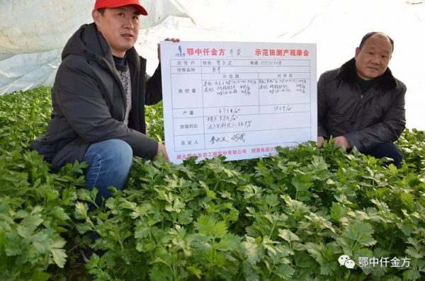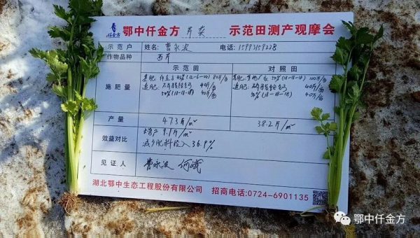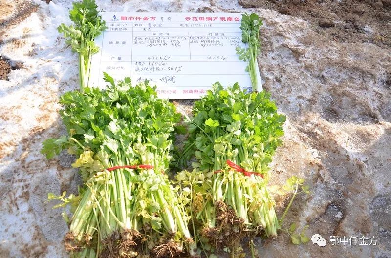 芹菜(西芹)測產結果:選取鄂中仟金方42%(12-6-24)和對照田其它廠家復合肥54%(18-18-18)中間區域西芹進行隨機取樣,選取3組,每組0.5平方米,觀摩會新型職業菜農現場監督取樣,鄂中仟金方中醫養護隊員和示范戶親自采收,保證采收程度相同,采收136株,3組綜合測產,仟金方區域47.3斤,對照區域38.2斤,增產9.1斤,畝增產4040.4斤。折除水分測算,平均畝增產3401.7斤。按70%商品計算為2381.2斤,按當前批發價0.8元每斤,畝增收1904.96元。減少肥料投入36.9%,示范田減少農藥及人工投入兩次,平均畝節本95元,畝節本增效1999.96元,鄂中仟金方施用減肥增效明顯。