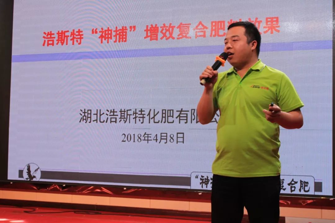 沈丘縣俊城農資有限公司總經理李俊成致歡迎辭。他用感動、感恩、信任三個關鍵詞,表達了與湖北浩斯特化肥有限公司及廣大經銷商十年風雨同舟,不斷成長的感激之情,傾力打造推廣湖北浩斯特化肥有限公司“神捕”系列產品,攜手再創未來的美好愿景。