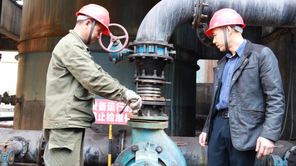 圖為修理工在廠領(lǐng)導(dǎo)指導(dǎo)下對(duì)設(shè)備進(jìn)行維護(hù)保養(yǎng)?? (高中?? 攝)